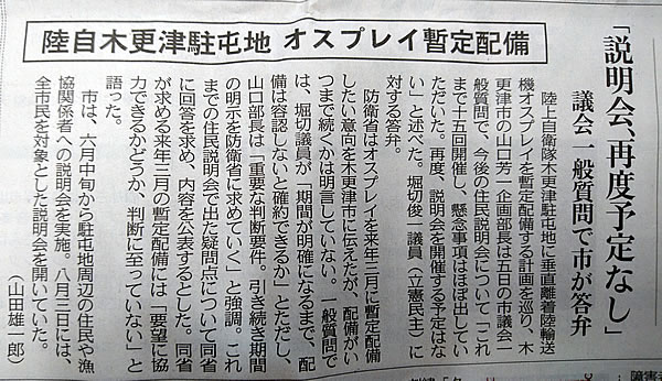 特にオスプレイの暫定配備の問題は市議会の殆どは自民・公明の議員のため暫定配備ありきで市と一緒に進める気配が濃厚。